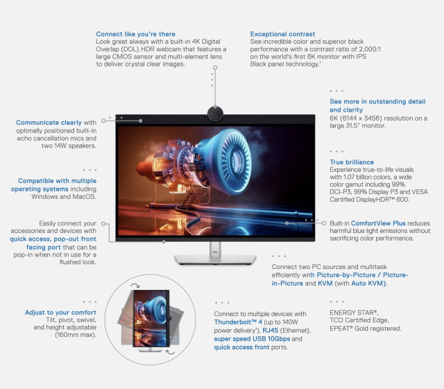 Dell's new UltraSharp 32-inch 6K monitor that rivals Apple's Pro Display XDR is now available for purchase. The company touts it as the world's first 6K-resolution monitor with IPS Black panel technology for higher contrast and deeper blacks. It's currently on sale for $2599.99, nearly half the price of the Pro Display XDR. Although it falls short on some specs, its price makes it a solid alternative.