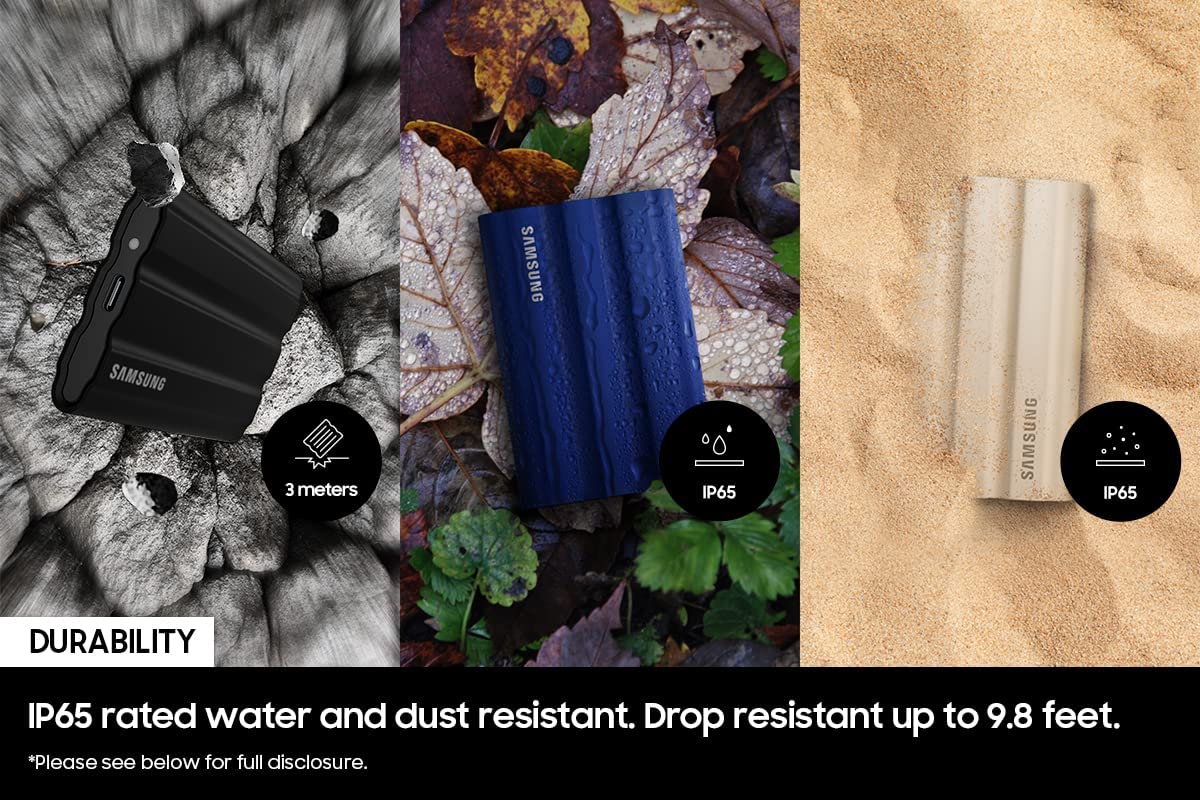 Features: ● ADOBE MEMBERSHIP: Get a two-month membership of Adobe Creative Cloud Photography plan on us when you purchase and register an eligible 1TB or 2TB Samsung SSD*.Specific uses: Business, personal ● RUGGED DURABILITY: Tough, fast, and compact, the all new rugged PSSD T7 Shield is built to endure with the space to create thanks to an IP65 rating for Dust and Water resistance.date transfer rate:1050.0 megabytes_per_second ● KEEP COOL AT HIGH SPEED: Transfer massive files in seconds; USB 3.2 Gen 2 and PCIe NVMe achieve soaring sequential read/write speeds of up to 1,050/1,000 MB/s, allowing you to edit directly from the drive; The high-tech rubber exterior with Dynamic Thermal Guard controls heat to maintain steady performance for even giant projects ● MIGHTY TOUGH: Ready for the rough and tumble; Shoot on location and wander the wild while feeling confident your data is securely resistant against water and dust with an IP65 rating; The rugged design and advanced outer elastomer add extra durability to even endure a 9.8 foot drop ● COMPATIBLE WITH YOUR DEVICES: The T7 Shield is compatible with PC, Mac, Android devices, gaming consoles, and more; Included in the box are USB Type C-to-C and Type C-to-A cables for added convenience ● DURABLE YET STYLISH: Take your pick;1 TB or 2 TB gives you colossal space in sleek colorways of blue, beige, or black; The stylish rubberized grip prevents slips so it stays in your hands; Bring everything with you and look great doing it. ● All firmware and components, including Samsung's world- renowned DRAM and NAND, are produced in-house, allowing end-to-end integration for quality you can trust. Operating Humidity 5% to 95% non-condensing