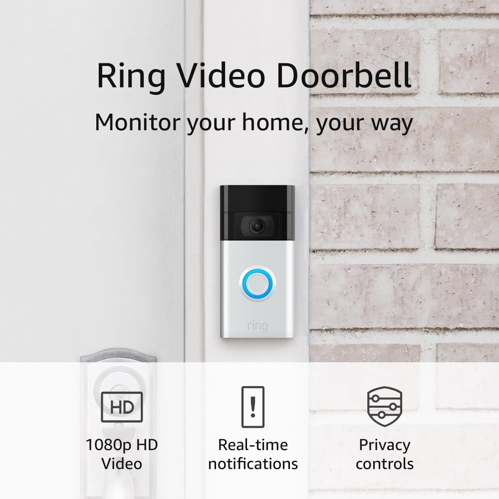 ● 1080p HD video doorbell with enhanced features that let you see, hear, and speak to anyone from your phone, tablet, or PC. ● An update from the original Ring Video Doorbell, enjoy improved motion detection, privacy zones and audio privacy, and crisper night vision. ● Receive mobile notifications when anyone presses your doorbell or triggers your built-in motion sensors. ● Powered by the built-in rechargeable battery or connects to existing doorbell wires for constant power. ● Easily setup by connecting your Ring Video Doorbell to wifi through the Ring app and mounting with the included tools. ● With a Ring Protect Plan (subscription sold separately), record all your videos, review what you missed for up to 180 days, and share videos and photos. ● Pair with select Alexa-enabled devices to enable announcements and two-way talk for convenient in-home monitoring. With a Ring Protect plan (subscription sold separately), Alexa can also make voice announcements and automatically show live video feed on an Echo Show, Fire TV, or Fire Tablet when your Ring doorbell detects a person or package.