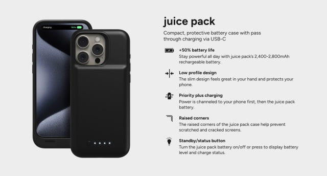 The new juice pack is a rechargeable integrated battery case with a 2400-2800mAh internal lithium-ion polymer battery. When connected to power source via USB-C, an intelligent Priority+ feature enables pass-through charging, so your iPhone always receives power first. Once fully charged, the juice pack battery case will charge second.