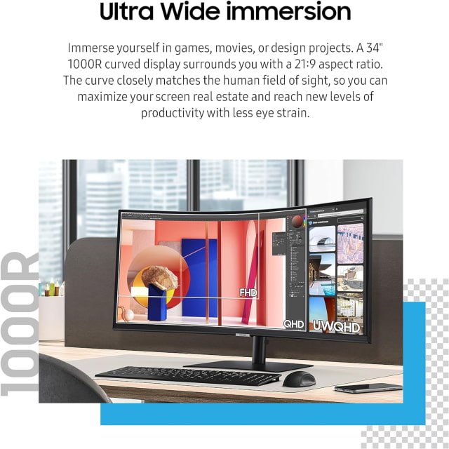 Features ● FEEL FULLY IMMERSED: Immerse yourself in gaming, movies or design projects while surrounding yourself with the 34 inch ultrawide curved display featuring a 21:9 aspect ratio; Ultra WQHD allows you to experience truly seamless multitasking on just one screen.Specific uses for product - Business ● ENHANCED CONCENTRATION & COMFORT: Maximize work productivity and reduce eye strain; 1000R curvature matches the curve of the human field of sight and limits eye strain experienced with flat monitors ● 1 BILLION COLORS WITH HDR10: With a wide range of colors, near limitless hues and HDR10, which makes dark colors darker and the brightest colors even brighter, content is a joy to look at ● CLUTTER FREE SETUP: Ditch the clutter and keep connected; S65UA features a USB Type-C port with 90W charging to power your laptop and transmit data with just one cable, keeping your desktop clean ● RELIEVE EYE STRAIN: Intelligent Eye Care keeps eyes fresh and strain-free; For late-night projects, brightness and color temperature adjust in any environment; PC monitor also protects against excessive blue light with eye saver mode and a flicker free feature