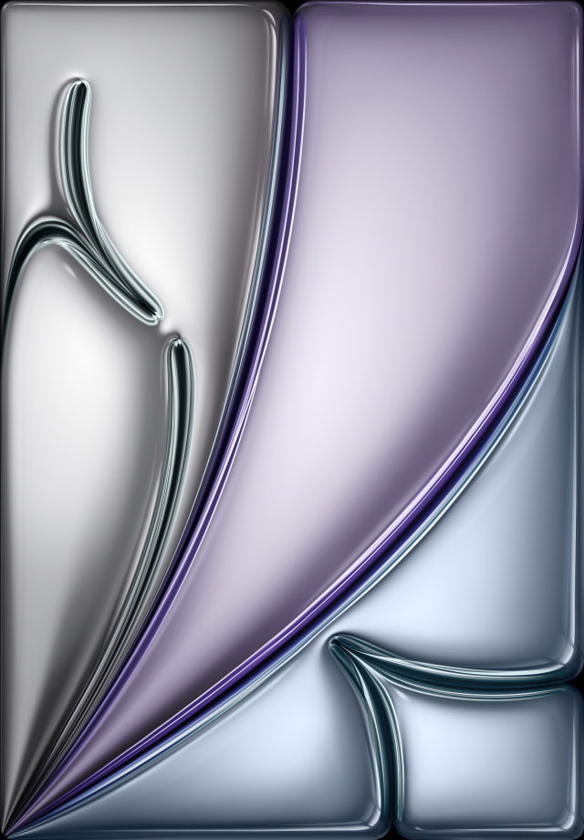 The new wallpapers for the 2024 iPad Air beautifully showcase the capabilities of its Liquid Retina display. Each wallpaper, designed to match the device's body colors—space gray, starlight, purple, and blue—features dynamic, flowing shapes that highlight the vivid and accurate P3 wide color spectrum. The intricate, glossy 3D design of these wallpapers demonstrates the display's high brightness and sharp resolution, making colors pop and shine in any lighting condition due to the anti-reflective coating and True Tone technology. These vibrant, artistic wallpapers enhance the aesthetic appeal of the iPad Air, while emphasizing the superior visual experience users can expect from the device.