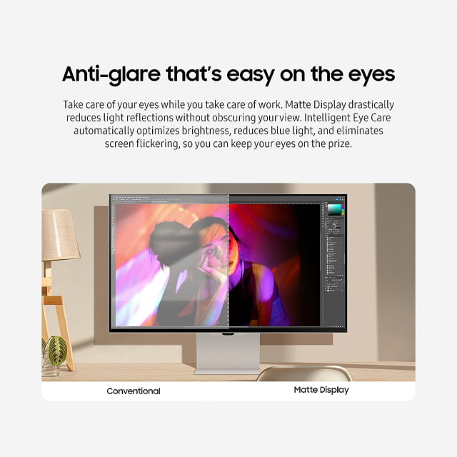 Features ● 5K RESOLUTION: 5K provides more pixels than 4K, with 218 PPI for incredible detail; 99% DCI-P3 delivers color saturation to bring your ideas to vibrant life, and factory-calibrated color accuracy delivers true color representation ● MATTE DISPLAY: Matte Display drastically reduces light reflections without obscuring your view; Intelligent Eye Care automatically optimizes brightness, reduces blue light, and eliminates screen flickering, so you can keep your eyes on the prize ● THUNDERBOLT 4 & DP PORT: A 5K monitor that connects to your favorite Windows and Mac devices with DisplayPort and Thunderbolt 4 connectivity; New Thunderbolt 4 compatibility enables you to consistently transfer data more reliably ● 4K SLIMFIT CAMERA: Always capture your good side; The 4K resolution of the built-in SlimFit camera keeps video conferencing crystal-clear; Capturing content in high resolution has never been easier ● SLIM METAL DESIGN & ERGONOMICS: Slim metal design works in any space, with a height-adjustable screen that tilts for the best angle; Pivot 90 degrees to view long docs with less scrolling; Plus, keep desktop clutter-free VESA compatible mounting ● APPLE AIRPLAY: Sometimes one screen just isn't enough; With Apple AirPlay, mirror or extend your screens to get more done; Wireless dual screens increase productivity, without increasing the number of plugs ● SMART TV APPS: When the work is done, let the play begin; Seamlessly switch to entertainment mode with embedded Smart TV Apps which have all of today's hottest streaming content, easily accessible on one screen ● SMART CALIBRATION: With Smart Calibration and a smartphone, screen can be customized; Choose between DCI-P3 or sRGB color space and set your preferences, color temperature, luminance and gamma settings without extra tools or procedures ● GAMING HUB: Samsung Gaming Hub is the ultimate home for gaming; instantly play the biggest games from top streaming partners, with no PC or console needed; Discover new games or replay old favorites all in one place