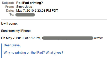 When asked why there are no printing capabilities on the iPad, Steve Jobs replied, "It will come."