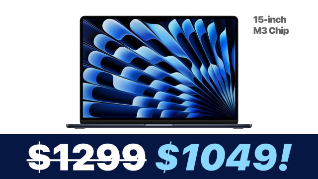 Apple's new 15-inch M3 MacBook Air is on sale for $250 off today. The Prime Day deal drops the laptop's price down from $1299 to $1049, its lowest price ever!