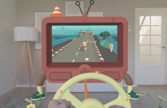 WHAT THE CAR? by Triband Indie developer Triband's hilarious racing adventure takes on a whole new dimension. Using a floating TV portal with legs and an extendable steering wheel, players with Apple Vision Pro will use their hands — as if holding a physical steering wheel — to maneuver an unconventional race car with constantly changing features, such as legs, wings, and even the common cold. The wacky gameplay elements leverage spatial computing to pop out of the screen, making each race an adventure full of lively twists and turns.