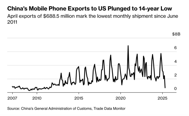 Shipments of Apple's iPhone and other mobile devices from China to the U.S. plummeted in April, reaching their lowest point since 2011, according to data from China's General Administration of Customs via Bloomberg. This sharp decline highlights the significant impact of U.S. tariffs on the trade of high-value goods between the two countries.