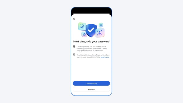 Setting up a passkey can be done in the Accounts Center within Facebook's settings, or you may be prompted to create one when you log in. While the feature is currently limited to mobile devices, you will still be able to use your password to log in on a desktop computer or on devices that do not yet support the new standard.
