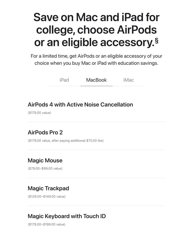 This year's offer provides significant value for those heading back to school. Qualified purchasers of a new MacBook Air, MacBook Pro, or iMac can choose from a selection of promotional products, including the Magic Mouse, Magic Trackpad, AirPods 4 with Active Noise Cancellation, or the AirPods Pro 2. For the first time, a Magic Keyboard with Touch ID and Numeric Keypad is also an option. The value of the accessory, ranging from $79 to $199, is applied as an instant credit at the time of purchase.