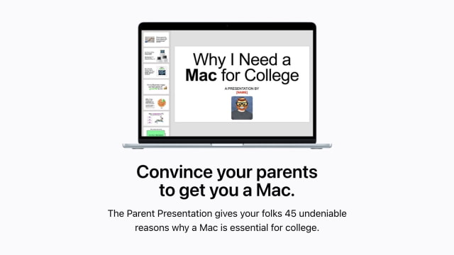 The new ad, titled "How to Convince Your Parents to Get You a Mac," is framed as a "College Prep Assembly" where a presenter schools students on how to make their case. After an unconvincing first attempt by an audience member, the host introduces "The Parent Presentation," a customizable slide deck available in Keynote, PowerPoint, and Google Slides that's filled with parent-friendly arguments.