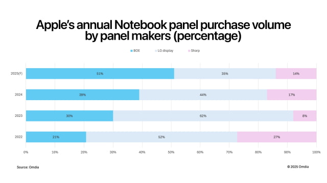 A new report from Omdia says that BOE is set to become Apple's top MacBook display panel supplier in 2025, a first for the Chinese display manufacturer. The shift will reportedly see BOE capture a 51% share of Apple's MacBook panel supply, while LG Display, the historical leader, will see its share fall.