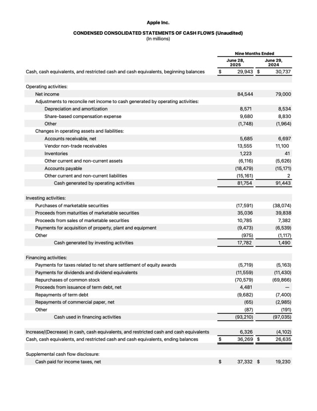 Apple today announced financial results for its fiscal 2025 third quarter ended June 28, 2025. The Company posted quarterly revenue of $94.0 billion, up 10 percent year over year, and quarterly diluted earnings per share of $1.57, up 12 percent year over year.