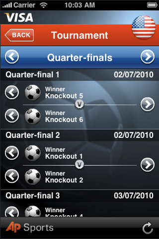 There are a handful of cool World Cup apps out there. The official app from ESPN has the best bracket predictor of the ones Ive seen. Also check out The Beautiful App. It has some awesome social features to help you celbrate the Cup with your friends. http://itunes.apple.com/us/app/the-beautiful-app/id375385266#