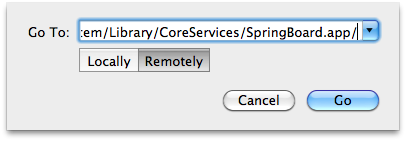 Step Six Input /System/Library/CoreServices/SpringBoard.app/ into the entryfield, make sure Remotely is selected, and click the Go button.